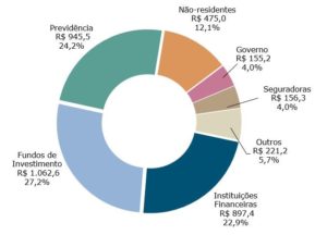 Inclui a carteira própria de bancos comerciais nacionais e estrangeiros, bancos de investimento nacionais e estrangeiros, corretoras, distribuidoras e bancos estatais.